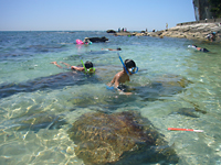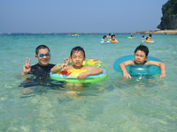 今日も6時に起きるが、朝食まで2度寝する。昨日の教訓から今日は9時のパラソルレンタル開始に合わせて宿を出ることにする、時間が有ったので部屋でサンオイルをたっぷり塗っておく。宿を9時過ぎに出て昨日同様コンビニで飲み物と氷を補充しパラソルを借り準備を整え泳ぎ始める、ホウボウを見つけたので子供たちに見せる。 昨日同様飛行機の離陸を目安に昼食に、今日は海が見える売店でご飯を食べようとお店を探しているとおばちゃんが手招きをしてる(^^;) その姿があまりに面白いのでそこで食事(4)、隣に座ってた女の子グループは青春まっただ中、楽しそうだった、それはさておき昼食後に小さい網を買って白良浜の北側の岩場で生き物探し、ザリガニやカワハギの稚魚ハゼの類いを捕まえる。海からあげてみて海中で見た大きさと実際の大きさのギャップに今さらながら驚く。 2時ごろにかき氷を食べて3時20分ごろ海から上がり宿に戻る、今日は宿の風呂に入ろうとするが日焼けで痛くて入れない(T_T) 正だけは頑張って入った。